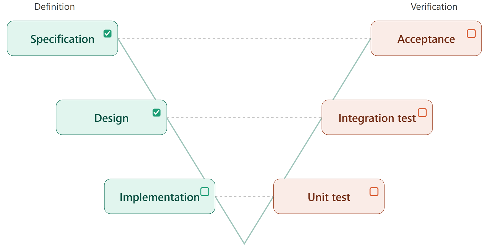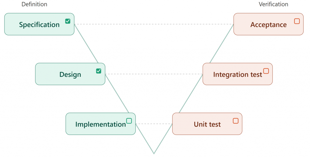(Remark: this is a simplified model that does not distinguish between system and software levels. However, I recommend NOT expanding it into system levels (e.g., system requirements, system design, etc.) for practical reasons.)